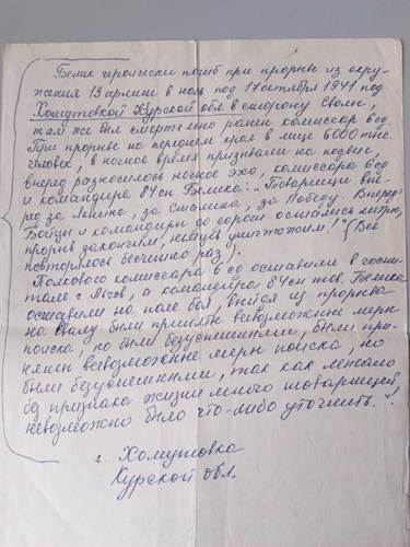 Нашей семье дороги воспоминания о том последнем бое командира 84 стрелкового полка майора Алексея Даниловича Белика и его товарищей, написанные старшиной медицинской службы Потатурко Евгенией Иосифовной (75 разведбатальон).